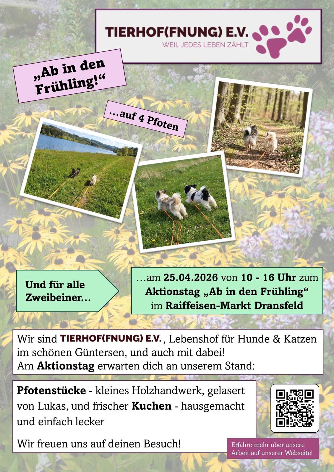 Am 25.04.2026 von 10 bis 16 Uhr findet im Raiffeisen-Markt Dransfeld der Aktionstag „Ab in den Frühling“ statt – und wir von Tierhof(fnung) e.V. sind mit einem Stand vor Ort vertreten.