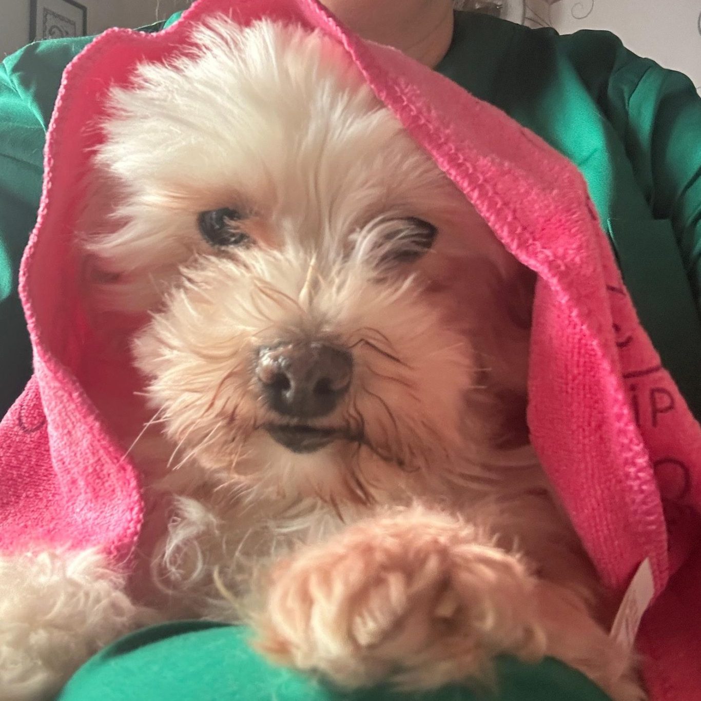 🐶 Roxi alias Flöckchen – Mini-Yorki, kaum schwerer als eine Tafel Schokolade, aber quirlig wie zehn. Mit entzündeten Öhrchen und Zahn-Drama.